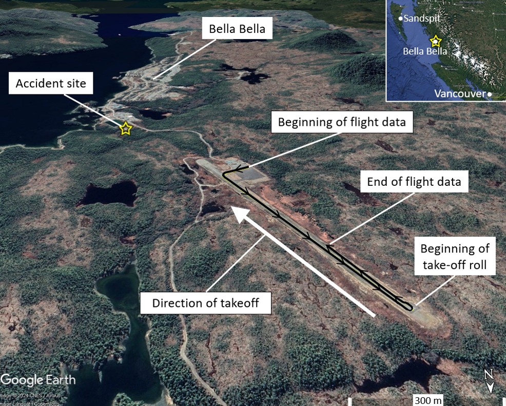 Figure 1. Map showing recorded flight data and accident site with an inset showing the location of Bella Bella (Source of main and inset images: Google Earth, with TSB annotations)