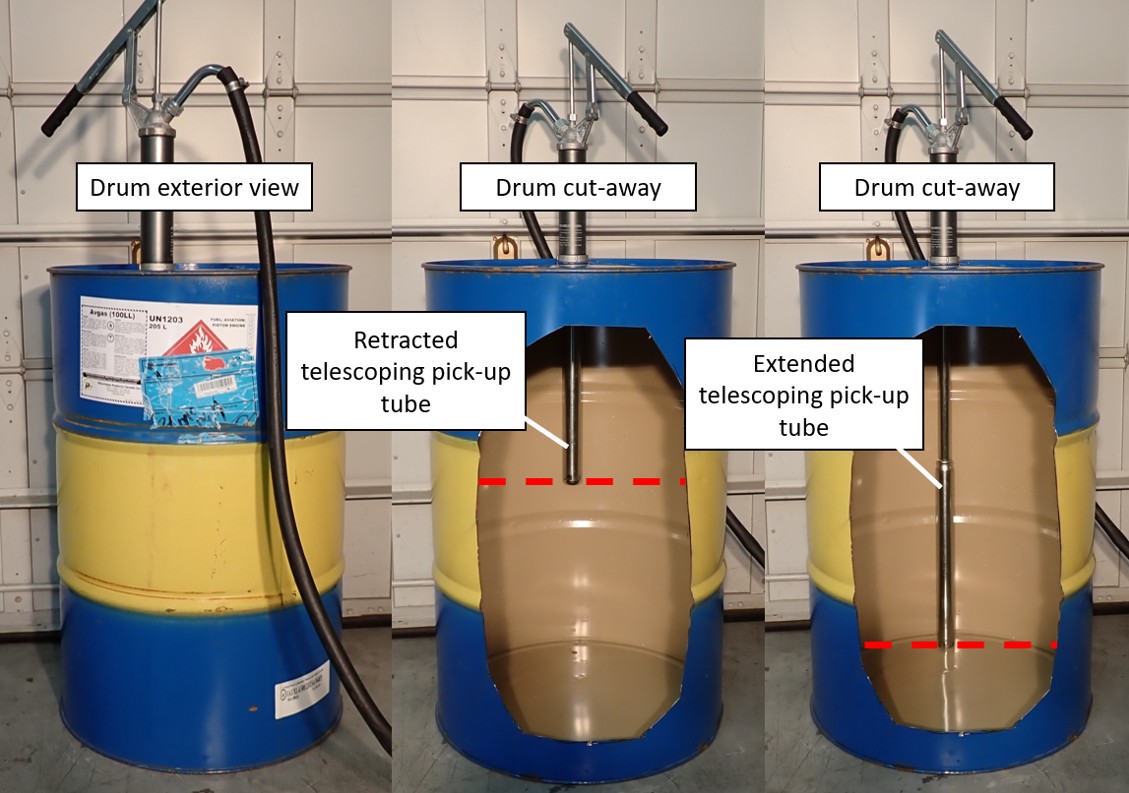 The pick-up tube must not reach the lowest point in the drum so that the lowest portion of fuel, likeliest to be contaminated, is not pumped into the aircraft.Transport Canada, TP 2228E-13, Take Five…for safety: Fuel Drum Etiquette, (April 2003), item 6b, at https://tc.canada.ca/en/aviation/publications/take-fivefor-safety-tp-2228/fuel-drum-etiquette-tp-2228e-13 (last accessed on 14 November 2025). The fuel filters used for drum fuelling should be replaced, at a minimum, annually.U.S. Department of the Interior, “DOI Operational Procedures Memorandum (OPM) – 20: Drum Fuel Management” (effective 01 January 2023), section 4C.7), p. 2. Filters should also be changed if a reduction in flow rate is observed.Ibid., section 4C.8). Fuel should pass through both a fuel particle filter and a water separator,Transport Canada, TP 14371E, Transport Canada Aeronautical Information Manual (TC AIM), AIR – Airmanship (05 October 2023), section 1.3.2: Aviation Fuel Handling, p. 385 at https://tc.canada.ca/sites/default/files/2023-10/aim-2023-2_access_e.pdf (last accessed on 14 November 2025). or a particle filter and an expanding go-no-go filterTransport Canada, TP 2228E-13, Take Five…for safety: Fuel Drum Etiquette, (April 2003), item 12, at https://tc.canada.ca/en/aviation/publications/take-fivefor-safety-tp-2228/fuel-drum-etiquette-tp-2228e-13 (last accessed on 14 November 2025). before being dispensed into the aircraft. The particle filter used should be a 5-micron filter, suitable for use with fuel.Federal Aviation Administration (FAA), Advisory Circular (AC) 20-125: Water in Aviation Fuels (10 December 1985), section 7.a.(5)(iii), p. 6. Drum fuelling must take place a safe distance from buildings, other aircraft, and people not involved in fuelling operations.Australian Government Civil Aviation Safety Authority, “Drum refuelling” [video] (09 December 2012), 1:14 to 1:43, at https://www.youtube.com/watch?v=q4dujKldZX8 (last accessed on 14 November 2025).