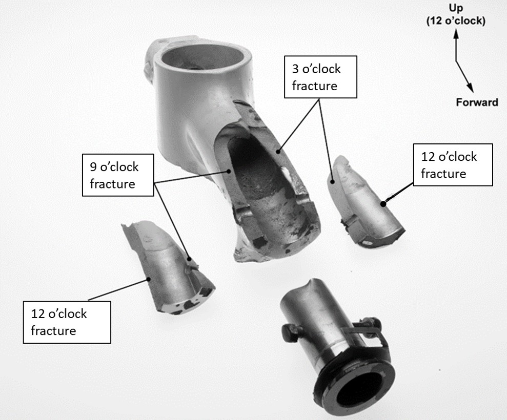 - The required eddy current inspection method described in the service bulletin was unable to detect the defects observed on the occurrence spigot housing. As a result, these defects remained undetected during service and contributed to the failure of the spigot housing.