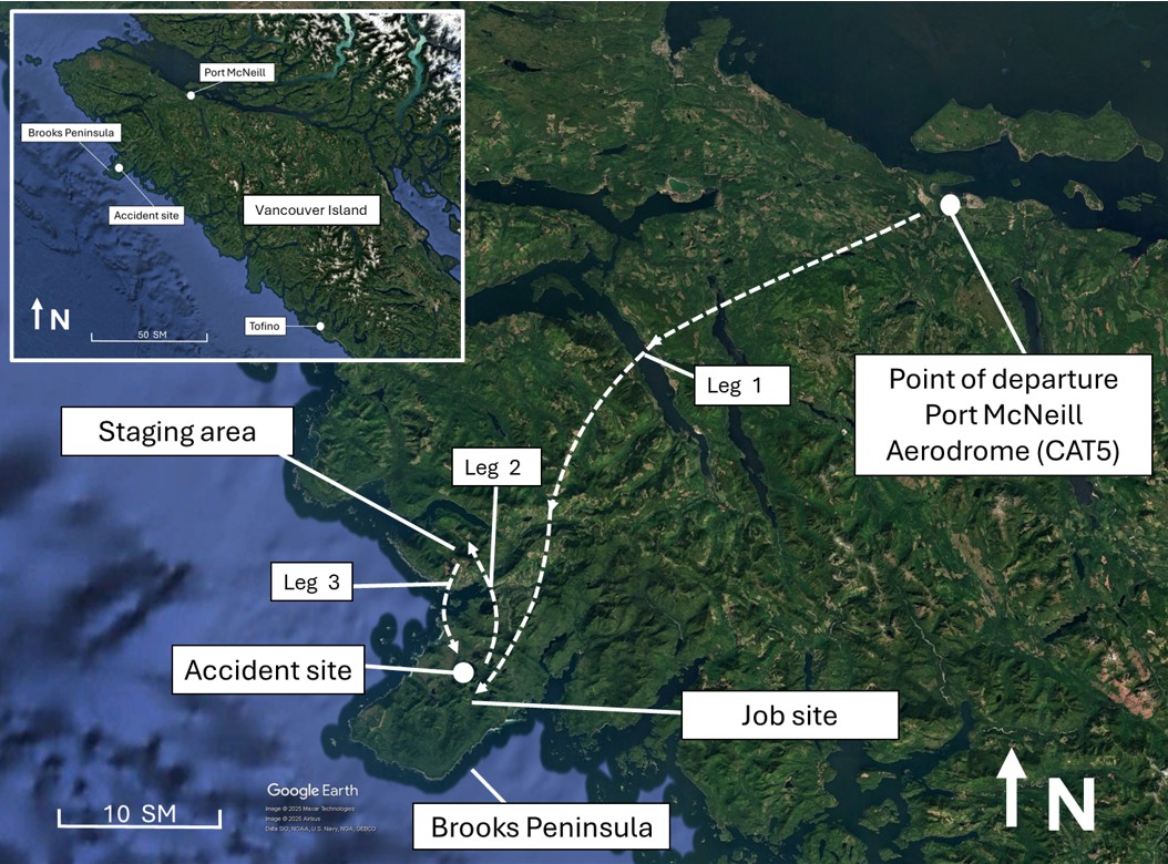 At approximately 0815All times are Pacific Daylight Time (Coordinated Universal Time minus 7 hours). on 15 August 2024, the American Eurocopter an EADS CompanyAirbus Helicopters currently holds the type certificate for the aircraft type. AS350 B2 helicopter (registration C-GWCT, serial number 7449), operated by West Coast Helicopters Maintenance and Contracting Ltd.,West Coast Helicopters Maintenance and Contracting Ltd. is based at the Port McNeill airport (CAT5), British Columbia, with a fleet of more than 15 aircraft. It provides helicopter support for activities such as tourism, mining, forestry, fire suppression, and environmental research under Canadian Aviation Regulations (CARs) subparts 702 (Aerial Work) and 703 (Air Taxi Operations). The occurrence flight was being conducted under Subpart 703 of the CARs. departed Port McNeill Aerodrome (CAT5)All locations mentioned in the report are in the province of British Columbia, unless otherwise indicated. on a day visual flight rules (VFR) flight in support of moving personnel and equipment to a job site approximately 32 nautical miles (NM) to the southwest of CAT5 that serves as a remote sensing location. The pilot and 1 passenger were on board.