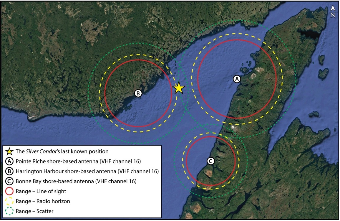 At 0230, the Cospas-Sarsat systemCospas-Sarsat is a satellite system designed to detect and locate the signals of distress beacons operating on 406 Megahertz (MHz) anywhere on Earth. The system then forwards distress alert and location data to search and rescue authorities. received a signal from the Silver Condor’s EPIRB. The signal information was relayed to Maritime Rescue Sub-Centre Quebec (MRSC), which began to call the emergency contacts listed on the EPIRB’s registration.