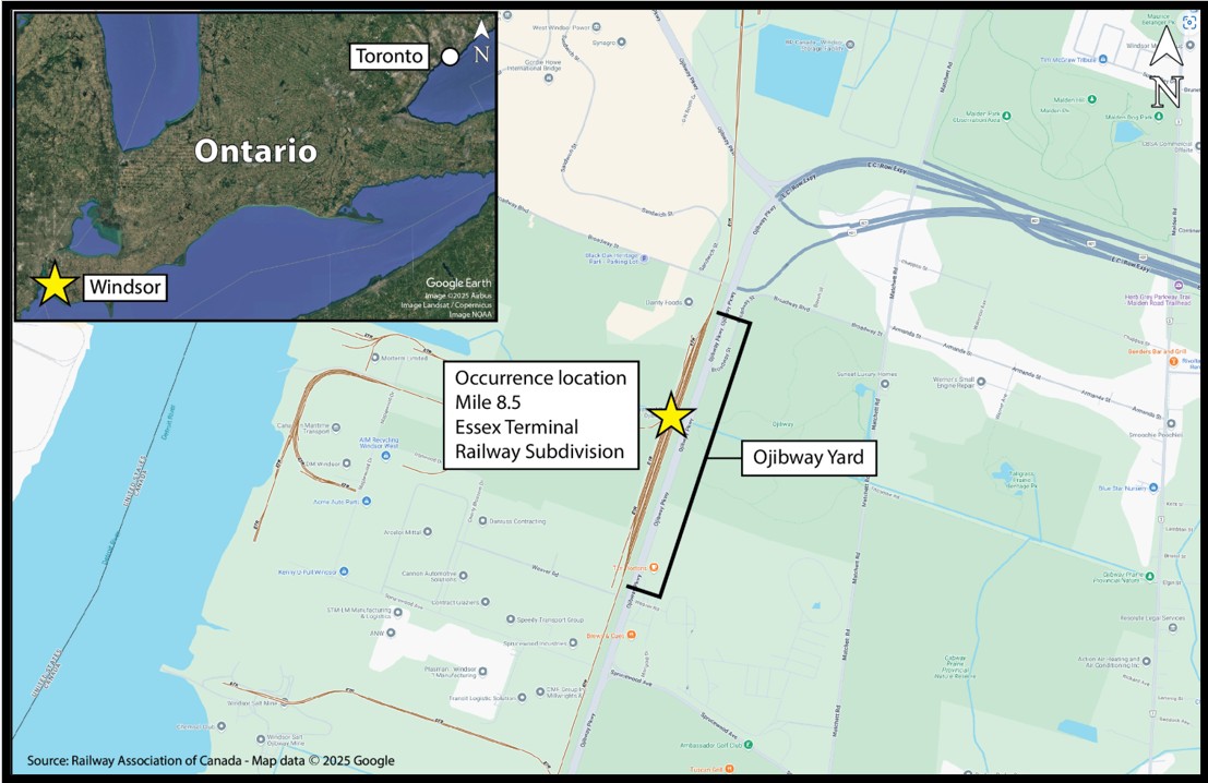 On 16 February 2025 at approximately 1000,All times are Eastern Standard Time. the crew of Essex Terminal Railway Company (ETR)Essex Terminal Railway Company is a federally regulated short line railway that operates about 54 km of track in Ontario, starting from the east side of Windsor and ending in Amherstburg. yard assignment 0700 was conducting switching operations at the Ojibway Yard (Mile 8.5 of the Essex Terminal Railway Subdivision) in Windsor, Ontario (Figure 1), when 2 kicked rail carsKicking is a switching operation that consists of uncoupling one or more cars in motion and allowing them to roll under their own momentum to a specifically designated track. travelling at about 5 mph struck a maintenance-of-way (MOW) employee standing between the rails of the lead track. At the time of the occurrence, the MOW employee was clearing snow from switch points, using a gas-powered leaf blower strapped to his back. The MOW employee sustained serious injuries.