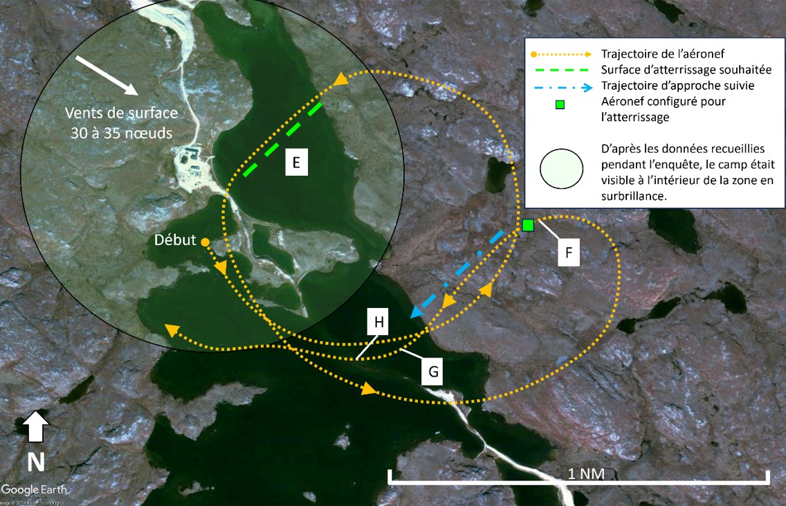 Pendant que l’aéronef remontait jusqu’à environ 300 pieds AGL, l’équipage de conduite a commencé à programmer une nouvelle approche improvisée sur un axe central prolongé dans l’OEPP. L’aéronef a amorcé un circuit vers la gauche (point « I » sur la figure 4) pour une 3e approche en vue d’un atterrissage en direction nord. Pendant le virage de l’étape vent arrière vers l’approche finale, l’aéronef a dépassé la trajectoire vers le nord souhaitée, mais l’a ensuite interceptée en utilisant une approche établie sur l’OEPP (point « J » sur la figure 4). Incapable de voir le lac, l’équipage de conduite s’est fié à l’OEPP pour obtenir des données sur sa position. Après avoir aperçu le camp routier à une distance d’environ ½ NM, l’équipage de conduite a déterminé que les vents de travers étaient trop forts pour poursuivre l’atterrissage en direction nord, et l’aéronef a de nouveau effectué une remise des gaz et dépassé le camp routier.