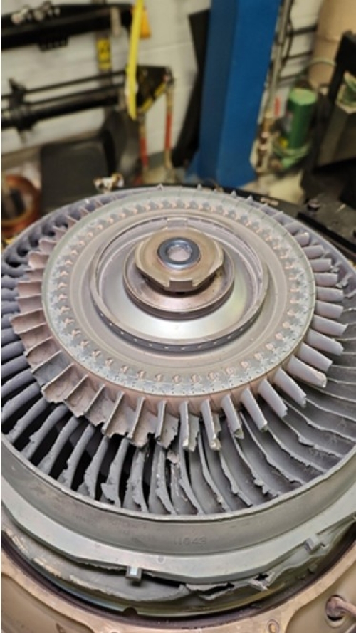 • le moteur n’a subi aucune rupture et est demeuré intact, à l’exception des 2 étages de la turbine de puissance, dont l’ensemble des aubes présentaient des fractures à mi-longueur (figure 2);