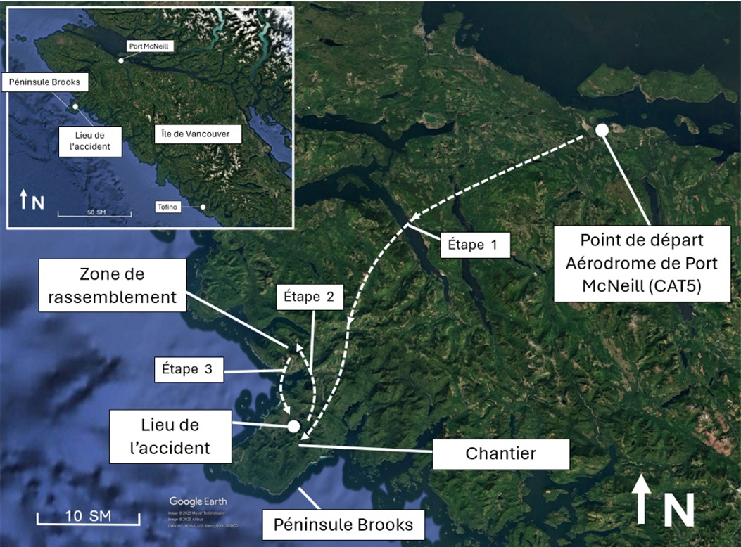 Selon l’équipement de suivi par satellite embarquéL’hélicoptère était équipé d’un système de suivi des vols par satellite Spidertracks. Les données du système ont été utilisées dans le cadre de l’enquête pour déterminer le profil de vol de l’hélicoptère., l’hélicoptère s’est dirigé vers le sud et s’est approché d’une crête située à environ 1300 pieds au nord du chantier à 9 h 41; le pilote prévoyait probablement s’approcher du chantier par le nord-ouest. L’hélicoptère n’a pas franchi la crête, mais a fait demi-tour vers l’est à 9 h 43, a volé vers le sud et s’est approché à nouveau du chantier, cette fois par le sud-est. À 9 h 44, l’hélicoptère a commencé son approche et est arrivé au-dessus du chantier environ 1 minute plus tard. Après un vol stationnaire d’environ 2 minutes, l’hélicoptère a quitté les lieux à 9 h 47 pour des raisons inconnues, et a volé vers le sud-est sur une distance d’environ 800 pieds avant de revenir au-dessus du chantier à 9 h 49.