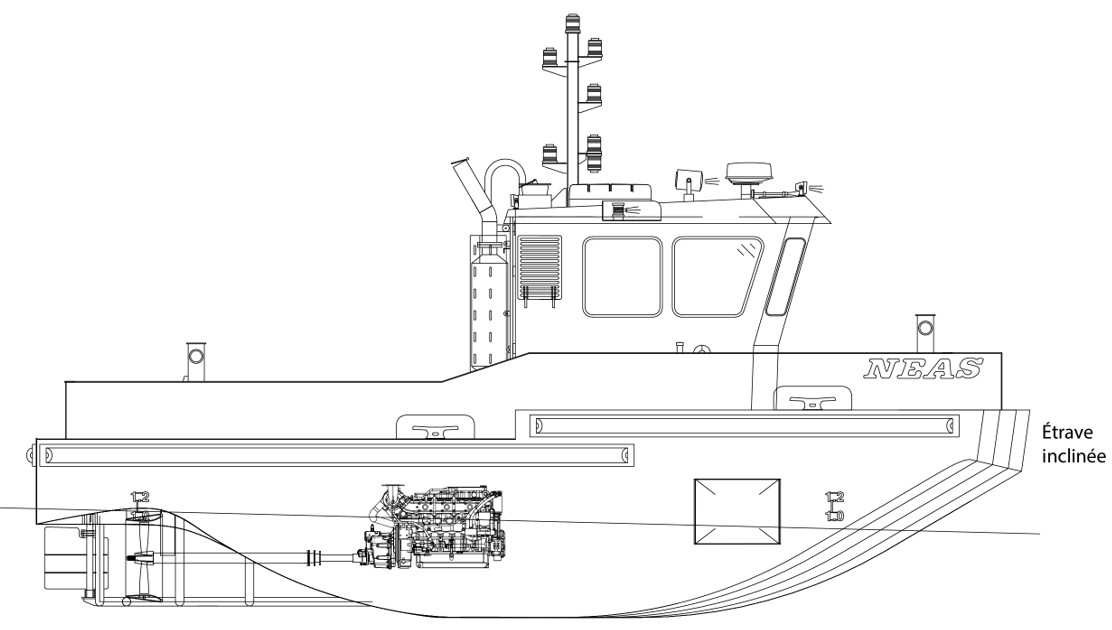Figure 2. Diagramme montrant une vue de profil du remorqueur Qimmiq et l’étrave inclinée (Source : NEAS Inc., avec annotations du BST)
