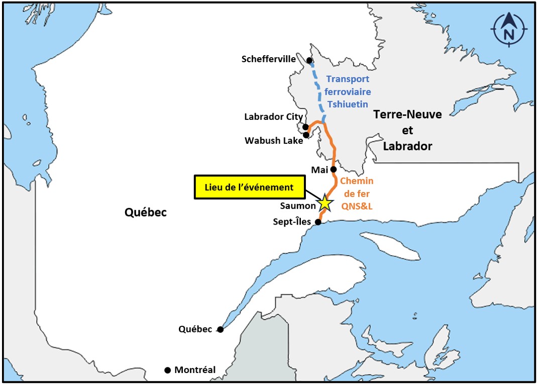 Le 3 novembre 2024, vers 14 h 37Les heures sont exprimées en heure normale de l’Est., le train de minerai BAL-481-F (le train) de la compagnie Champion Iron, un train-blocUn train-bloc est un train transportant une seule marchandise (en l’occurrence, du minerai de fer) dans des wagons de type, de longueur et de poids semblables. exploité par le Chemin de fer QNS&L (QNS&L), est parti de la gare de Mai (Québec) et circulait en destination sud vers Sept-Îles (Québec) sur la subdivision de Wacouna du QNS&L. Le train comptait 3 locomotives (2 à l’avant du train et 1 aux deux tiers de la longueur du train) et 240 wagons-tombereaux chargés de minerai de fer. Il pesait environ 29 300 tonnesDans le présent rapport, « tonne » désigne une tonne courte, soit 2000 livres ou environ 907 kg. et mesurait 8600 pieds. Il était exploité par un seul mécanicien de locomotive (ML)Les trains de minerai du QNS&L sont exploités par un seul employé..