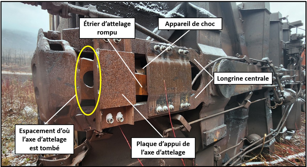 La barre d’attelage du bout B du 2e wagon s’est déboîtée après que l’étrier d’attelage s’est rompu, ce qui a entraîné le déplacement de l’axe d’attelage au-delà de la plaque d’appui. L’axe est alors tombé sur la voie, ce qui a désolidarisé le train et l’a rendu susceptible de subir une séparation.
