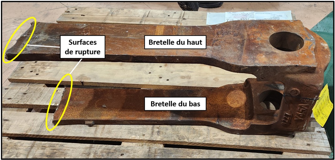 L’examen visuel de l’étrier d’attelage en cause a permis d’identifier que les 2 bretelles s’étaient rompues par rupture fragile, près de leur partie arrièreLe plan de rupture se trouvait à environ 19 mm d’un des 4 endroits où une coupe transversale est requise par les spécifications de l’AAR afin de permettre d’évaluer la solidité interne de la pièce..