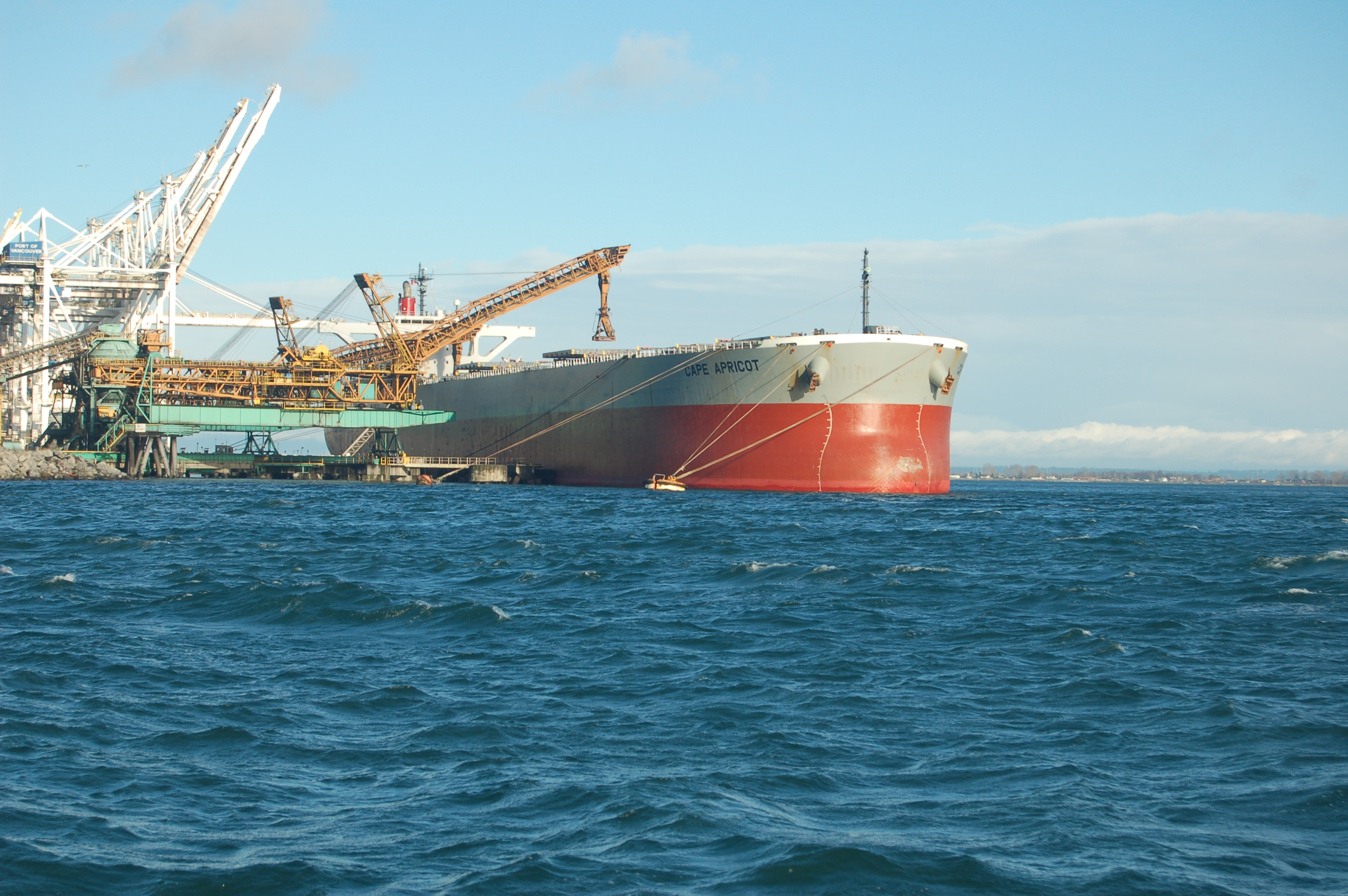 On at 0045 Pacific Standard Time the bulk carrier Cape Apricot, while under the conduct of a pilot, struck the causeway and conveyor system connecting Westshore Terminals berth 1 to the main terminal at Roberts Bank, British Columbia. As a result of the impact, the causeway and conveyor collapsed into the water, and the vessel's bow sustained damage. There was minor pollution and no injuries.