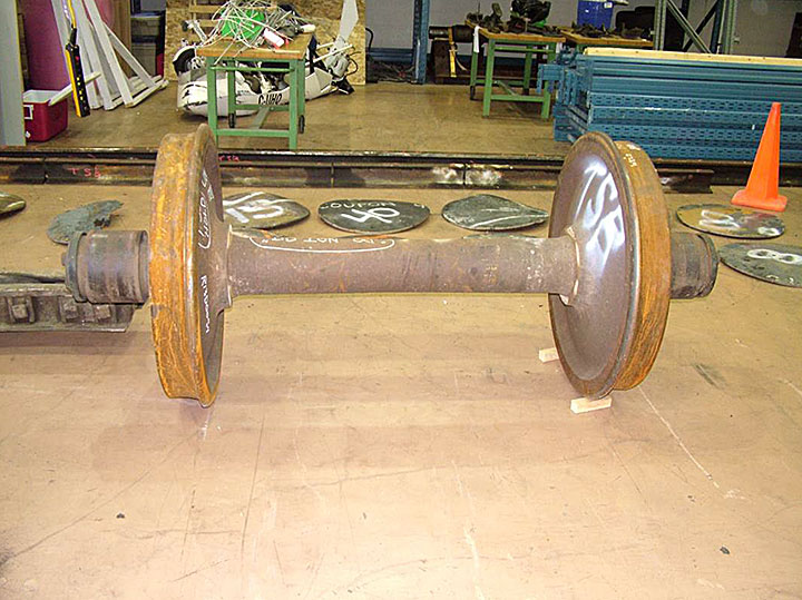 Figure 1 shows the wheel set as received. Both wheels were cleaned so an examination could be performed. The feature observed on the flange of wheel 83414 is shown in Figures 2 through 5. Close-up examination of the feature on the wheel flange revealed that there was a rub mark on either side of it and that its edges were rounded, with a worn appearance.