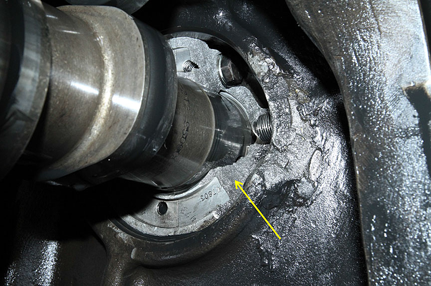 Removal of the crankcase inspection cover for PA R5 showed that the camshaft bearing between PA R4 and PA R5 was broken (Figure 6). A large section of the camshaft bearing had separated exposing the camshaft journal.
