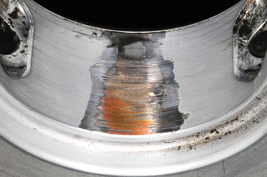 Cleaning of the area around the failed R4/R5 cam bearing revealed that the cam bearing bore had been previously repaired with a polymeric material (likely some type of epoxy) (Figure 36). A portion of the engine frame adjacent to the cam bearing bore had been broken away and replaced with this polymeric material. The repaired area had failed and some of the polymeric material was missing.