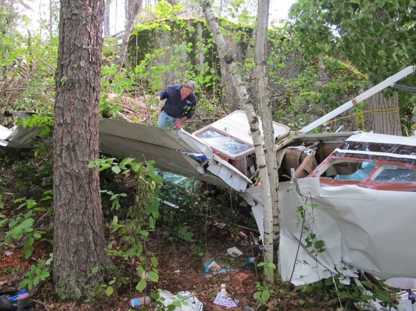 The aircraft wreckage was situated on tree-covered rocky terrain approximately 80 feet above lake level (Photo 1). The aircraft struck the ground at a descent angle of roughly 12° in a left bank. The fuselage was on its left side, with the right wing lying inverted ahead of the aircraft, but still attached at the front spar. The left wing was in 2 pieces. The inboard section was about 40 feet behind the fuselage. The outboard portion was 100 feet down the wreckage trail, in the top of a tree 20 feet above the level of the crash site.