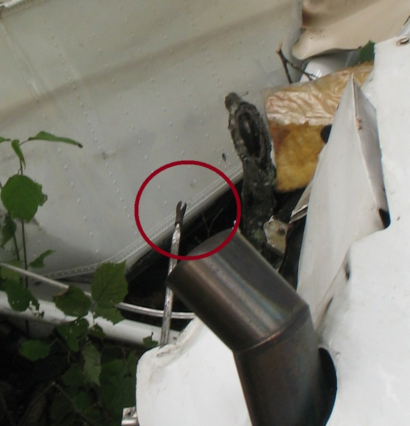 The bows of both floats were heavily damaged by impact with large trees. The front bracing wire that ran between the right float and the left fuselage attachment was lying loose in the wreckage. A clevis pin was missing from the clevis fork on the upper end of the bracing wire (Photo 2). The clevis pin in the opposite end was still in place in the clevis fork, and had been torn out of the wire-pull fitting at the front fitting of the right float. The 2 front seats were still latched on their respective seat tracks, and the seat-track safety clips were in place. The battery and master contactor had been wrenched from their mounting points, and the associated electrical cables were no longer connected. Continuity of the rudder, elevator, and stabilizer trim controls was established from the cockpit to the empennage. The flap and aileron cables had all failed close to the wing attachment points. Continuity of the flap and aileron cables was established from the cockpit to the failure points, and hence out to the wings. The flap selector was latched in the up position. The engine exhibited no sign of rotation at impact with the ground; however, at least 1 tree had been scarred with multiple slashes resembling propeller strikes.