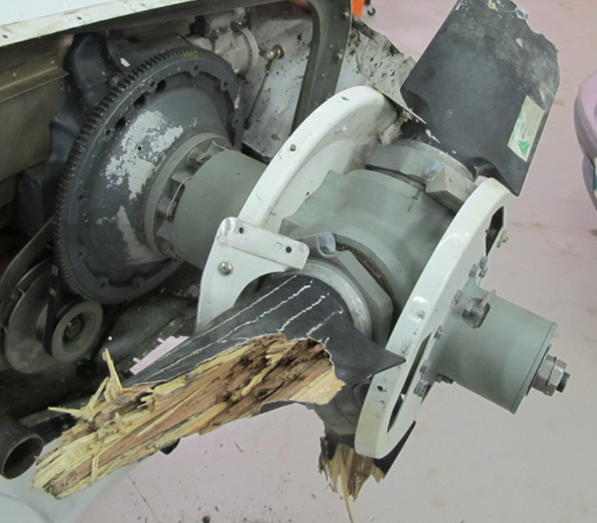 Damage to the trees surrounding the point of impact indicated that the aircraft was on a heading of approximately 280°M and in a very steep angle of descent as it struck the trees. The nose section and top of the fuselage were heavily damaged. Both wings were broken outboard of the main landing gear. The aircraft was on the ground, partially supported by the engine and pylon. The 3 wooden blades of the propeller had shattered with only a few inches of each blade protruding from the hub (Photo 1).