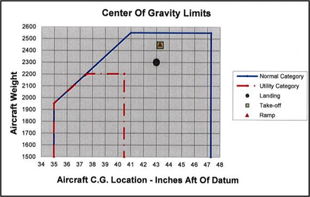 The maximum take-off weight (MTOW) for this aircraft type in the utility category is 2200 pounds, and the CG limit ranges from 35 inches to 40.5 inches aft of datum. In the normal category, the aircraft's MTOW is 2550 pounds, while its CG limit ranges from 35 inches to 47.3 inches aft of datum.