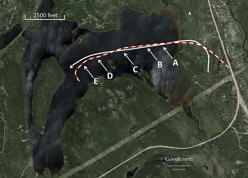 On the day before the occurrence, the flight crew had completed 53 water-drop flights at a forest fire located northeast of Wabush, Newfoundland and Labrador. Each flight, typically about 3 minutes long, consisted of scooping water from Moosehead Lake,Footnote 1 dropping the water on the fire, and then returning for another water scoop. During the scooping runs (Figure 1), the aircraft would typically touch down about 1250 feet (point A) from the eastern shore of the lake.