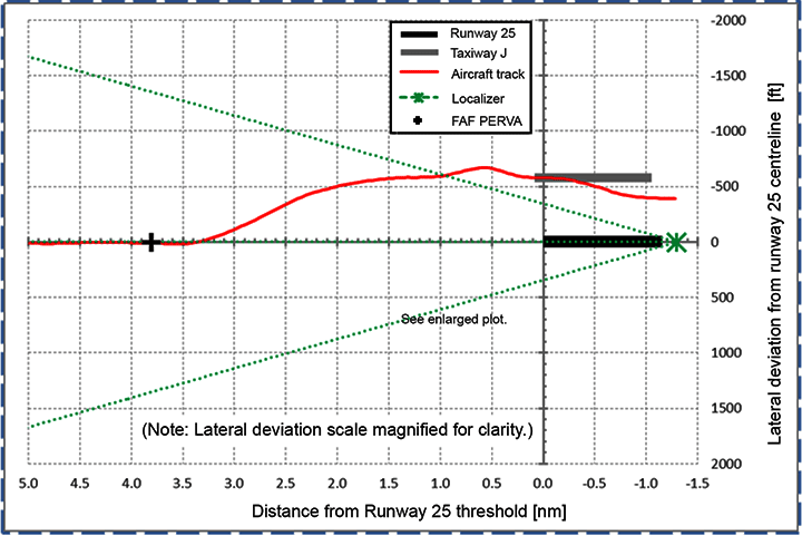 At 1837:57, the aircraft position was descending through 1.4 dots below the nominal glide slope, and the enhanced ground proximity warning system initiated a glide slope alert. Lateral deviation was 1.9 dots to the left and still increasing, as the aircraft was now on a track toward Taxiway J rather than the centreline of Runway 25. The glide slope alert ended at 1838:11, with the aircraft still 1.6 dots below the nominal glide slope, and lateral deviation 2.6 dots to the left, approaching full deflection. The crew requested that the CYMM tower controller confirm that the runway was clear at this time. The tower controller responded that it was.
