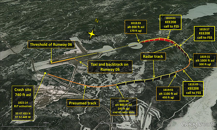 At 1819:01, the PIC made a radio call to the CYTH flight service station (FSS) advising that they were commencing a right turn to come back for a landing on Runway 06. The aircraft was unable to climb higher than approximately 400 feet above ground level (agl).