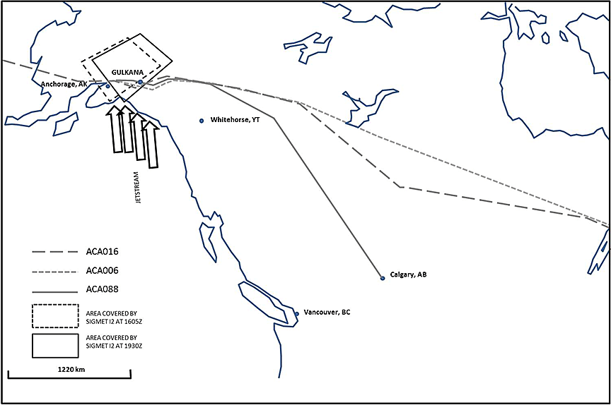 The routes of flight for ACA088, ACA016, and ACA006 were all in the vicinity of the southern coastal mountains of Alaska. The area covered by SIGMET I2 was located downwind of the area where the jet stream was expected to cross the southern coastal mountains.