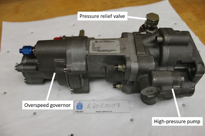 Metal contamination from an undetermined source was found in the high-pressure pump’s pressure relief valve and was preventing the valve from sealing. The impeded seal decreased the pressure output from the high-pressure pump, and decreased the ability of the PCU to control the propeller pitch.