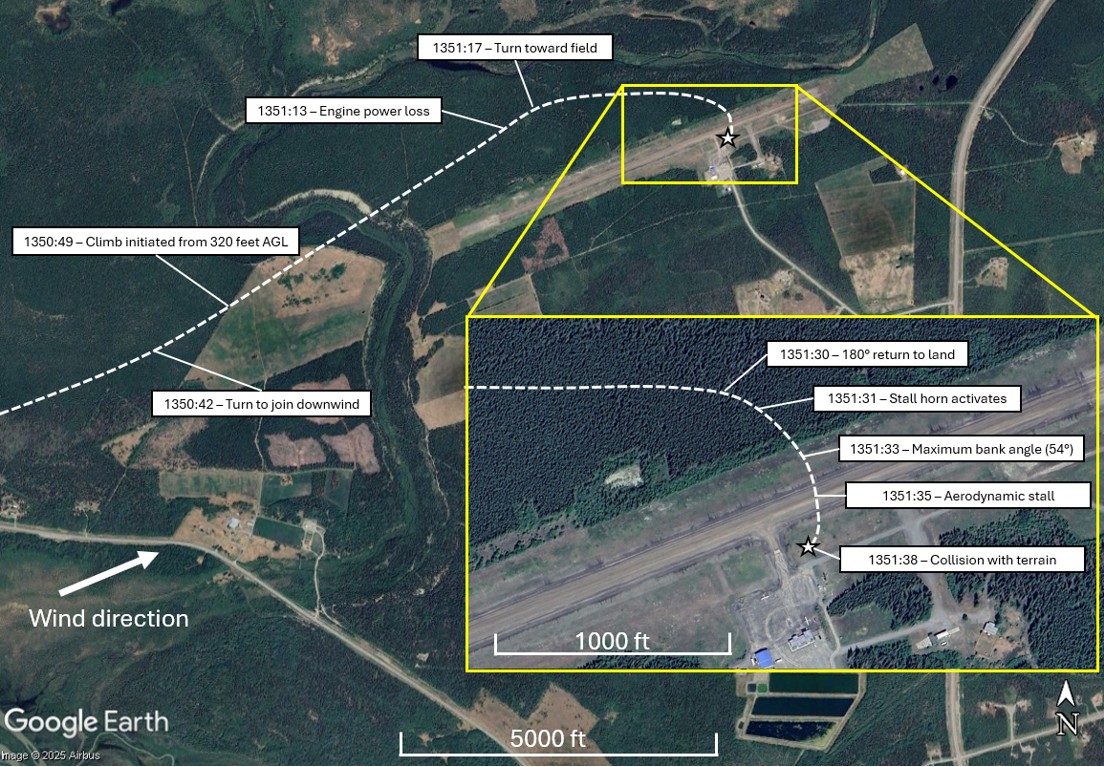 The aircraft entered the 180° turn to land at a horizontal distance of 600 feet from the runway centreline, at which point it would have required a steep bank angle to accomplish the turn and align itself with the runway centreline. When the aircraft’s bank angle increased, the requirement for lift also increased, and the aircraft began to lose altitude to compensate for the insufficient lift. The aircraft’s stall horn engaged immediately at the start of the turn and continued to sound for the remainder of the flight. When the aircraft reached its maximum bank angle in the turn, it showed signs consistent with the wing exceeding its critical angle of attack. The aircraft stalled at a height and in an attitude from which recovery was impossible.
