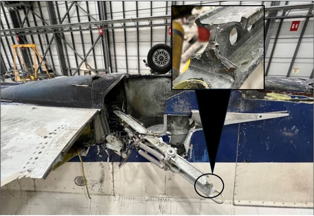During the occurrence, the right MLG outboard side-stay fractured at the connection to the landing gear strut; the landing gear then folded inward. The side-stay remained in the down-and-locked position (Figure 5).