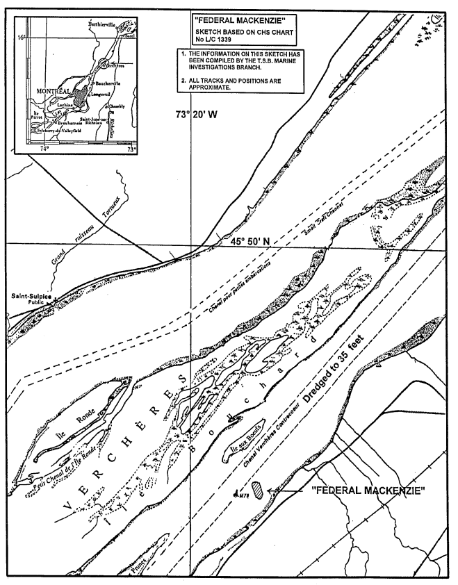 When propulsion was lost, the vessel veered to port. Despite corrective helm action, the swing accelerated. At 2122, the vessel moved out of the navigable channel and grounded on the south side, approximately one cable east of buoy M79 in position 45°48′18″N, 73°19′19″W.