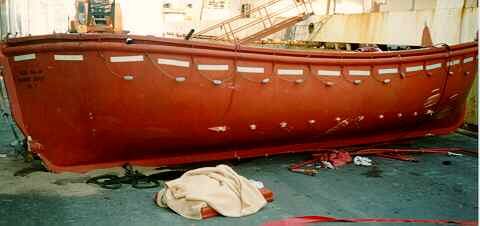 The ship's log indicates that the starboard lifeboat was launched during a drill on 21 October 1993. The entry reads: "At 1000 hrs. stb. lifeboat prepared and lowered to water level. All moving parts checked and greased; also limit switches tested and found in good working condition."