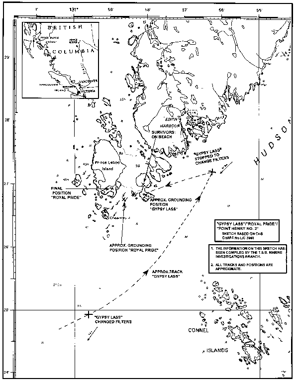 The wind had veered to the south-east at 25 to 30 knots with one- to two-metre seas and the combined effect of an ebbing tidal current and the onshore wind caused the "GYPSY LASS" to drag anchor. She grounded off an unnamed island near Prince Leboo Island, about one mile south-west of the entrance to Edith Harbour. As the crew members prepared to abandon ship, they gathered supplies and flares, and put on their immersion suits.