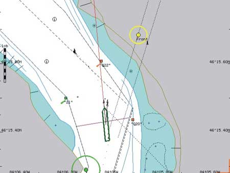 As shown on the ECDIS print out, at 0409 the ship's speed over the ground (SOG) was reduced from 10.9 to 7.2 knots (Position 5 on the throttle), as the vessel approached Mud Lake Junction buoy. The gyro was checked on Winter Point and had no error. The vessel's position was reported to the United States Coast Guard (USCG) Vessel Traffic Services (VTS), known as "Soo Control." At about 0435 the Algontario was steering on the Sailor's Encampment Range lights (Course 9) in the 8.23 m (27 ft.) project depth lane of the Neebish Channel. There was no ice or traffic reported in the vicinity of the vessel.