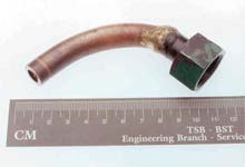 When installed at the shipyard, the connecting piping of the servo power units was copper. The piping connections were installed using direct braising methods and simple butt joints (Photo 3). Joints contained much excess braising material on the exterior, and the one examined in detail during the course of the investigation showed an overflow of braising material into the internal bore (Photo 4). It is estimated that the obstruction would restrict flow to about 70% of the design rate.Footnote 8 Bends in the piping were unsymmetrical and flattened at points to the extent that, during repairs subsequent to the grounding, TCMS required all servo power unit piping be replaced with steel piping, properly bent, fitted, and sized.