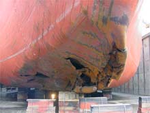 The forepeak and No. 1 starboard double bottom ballast tanks were punctured between frames 216 and 235 (approximately 12 m in length) running from the keel plate to the starboard bilge. The shell plating in way of damage was set in approximately 600 mm. The duct keel plate in way of frames 175 to 185 was also set in. Other bottom plates were set in as far astern as frame 151 and affected tanks 1 P, 2 P&S, 4 P&S, 5 P&S, and 7 S.