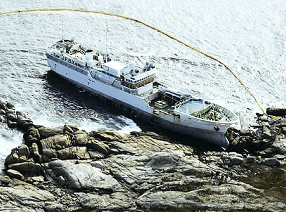 At approximately 2300, the Shinei Maru No. 85 was estimated to have been at or near full ahead speed when it ran hard aground near Portuguese Cove. None of the personnel on the bridge were aware that the vessel was in danger of running aground. The vessel was holed in two fuel tanks allowing oil to leak from the vessel. An oil spill containment boom was placed around the vessel soon after going aground, but a considerable and undetermined amount of oil pollution had been released into the environment. No one was injured.