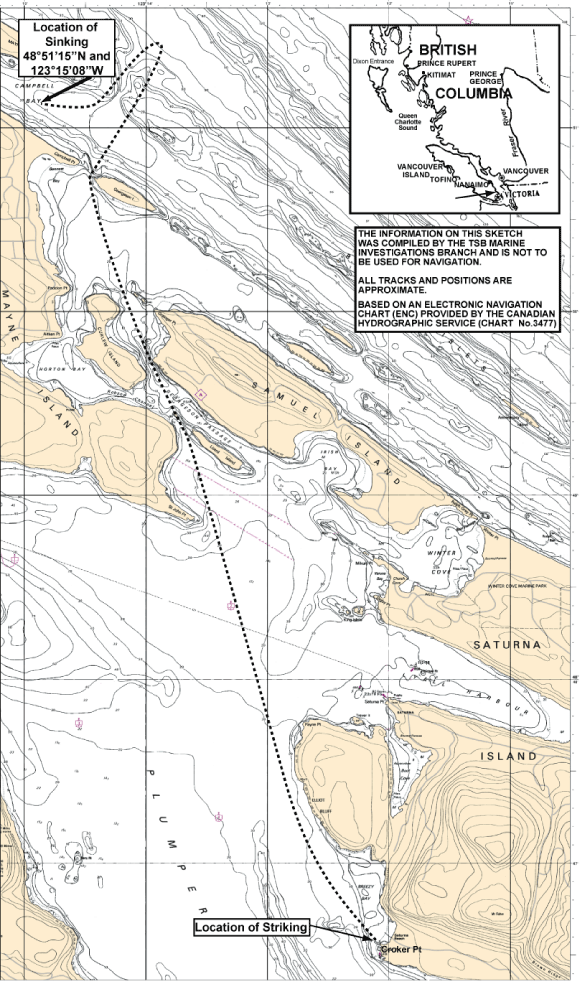 On 23 July 2009 at 0910,Footnote 4 the Explorathor departed Steveston, British Columbia, initially bound for the Gulf Islands, Footnote 5 British Columbia, with 32 passengers and two crew for a whale-watching excursion. The vessel's complement included the master and a crew member who was also working as a naturalist and tour guide. At 1205, the vessel began the return journey to Steveston via Plumper Sound to the Strait of Georgia, British Columbia. Travelling at approximately 28 knots, and with the navigational equipment in operation, the master used visual observation for the most part to navigate the passage. At approximately 1252, as the Explorathor was passing in close proximity to Croker Point on Saturna Island, Footnote 6 British Columbia, the vessel struck something and there was a scraping noise. Some on board hit their knees on the seats in front of them or almost lost their footing. Subsequently, passengers were reassured by the crew.