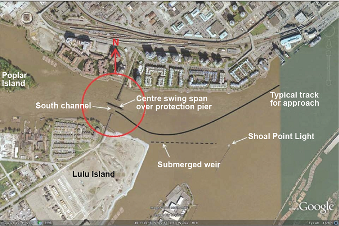 The mate then steered the tug past Shoal Point Light towards the northeast tip of Lulu Island. As the tug neared the island, the mate altered course to starboard to place the tug and tow just south of the transit line through the south channel of the bridge. The Harken No. 8 positioned itself at the port quarter of the barge to ensure that the barge stayed clear of the submerged weir and of the island.