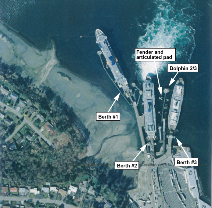 Damage to berth 2 (Appendix B) was limited to the port-side leads. This included damage to the outermost port-side fender and its articulated pad. As a result of the collision, the complete articulated landing pad broke free from the fender and ended up on the ocean floor. The attachment points between the fender and the articulated landing pad were torn away (Photo 4).
