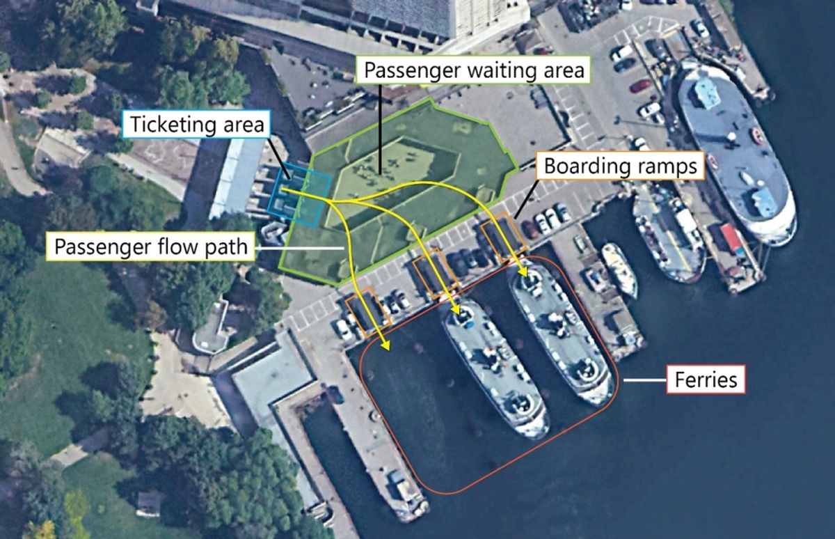 Passengers purchase tickets either online or at the ferry terminal. Once past the ticket booth, they enter a holding area, where there are gates for each of the destinations within the park (Figure 6). On busy days, the passenger holding area can fill with passengers; this area is visible to a ferry’s crew while it is docking, making the crew aware of the backlog of passengers to be carried. While passenger demand for the Toronto Island Park ferries has been increasing with the growth in residential buildings in downtown Toronto, the capacity of the ferries and terminal has remained the same; this has resulted in complaints from the public about the time it can take to access the ferry.The City of Toronto has announced a replacement strategy for its ferries; the proposed design would carry up to 1,300 passengers per trip. Source: City of Toronto, Ferry Fleet Replacement, at https://www.toronto.ca/city-government/planning-development/construction-new-facilities/park-facility-projects/ferry-fleet-replacement/ (last accessed 02 July 2024).