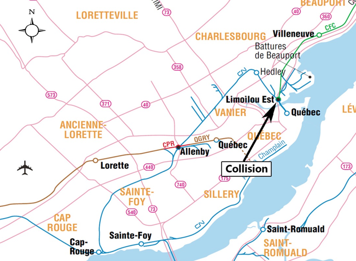 After the passengers detrained, the crew refuelled the locomotive and initiated a reverse movement in Limoilou Yard in preparation for the next day's trip to Montréal. To protect the reverse movement, the ICLE, who was positioned in the last passenger car of the train, used the radio to give instructions to the LE. At about 1940, the train started the reverse movement and placed the locomotive next to the refuelling platform, located at the exit of the station. During the refuelling operation, the ICLE got off the train to line the switch for crossover XX03, to allow the train to enter the yard.