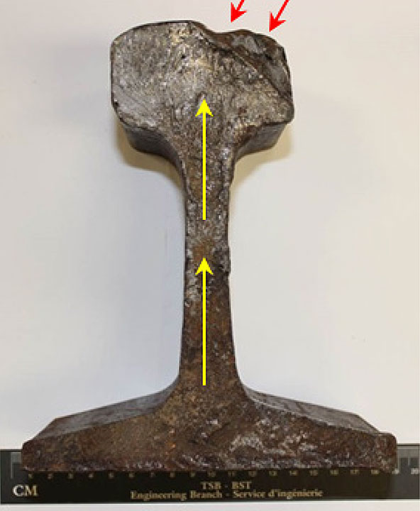 Fracture surface on rail piece number 9 showing direction of fracture propagation (yellow) and impact marks on head (red)
