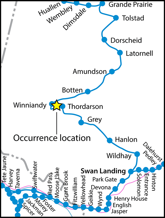 On 29 October 2016, the Canadian National Railway Company (CN) occurrence train crew, consisting of a locomotive engineer (LE) and a conductor, was ordered out of Winniandy, Alberta, for 0620.Footnote 1 The crew members put train A459 together and departed southbound for Swan Landing, near Grande Prairie, Alberta, at 0730. Upon arrival at Swan Landing at 1230, the crew yarded train A459, and then prepared northbound train A45851-29 (the train) for immediate departure.