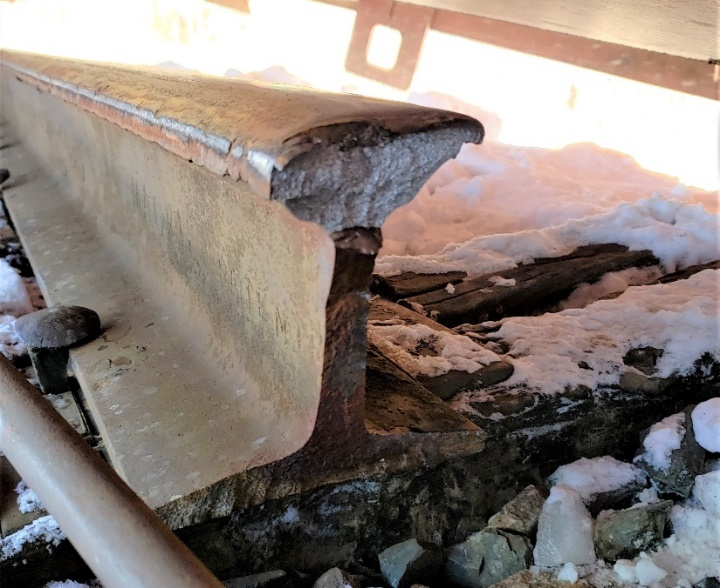 An ultrasonic rail test to detect possible internal rail defects was conducted on this section of track on 18 October 2019. At Mile 103.73, the south rail (left side of a westward train) could not be examined due to the shelling of the running surface of the rail. Therefore, on 14 November 2019, this rail had been replaced with a partly worn railFootnote 5 measuring 39 feet long (Figure 3).