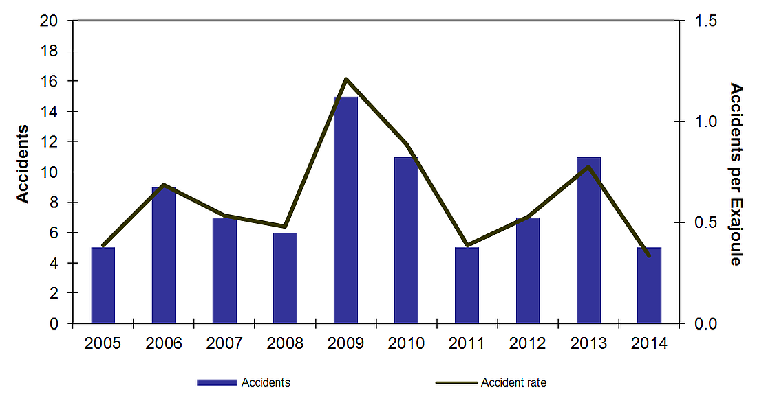 Pipeline activity increased 6% from 2013Footnote 3. An indicator of pipeline transportation safety in Canada is the pipeline accident rate. The 2014 rate (Table 2) was 0.3 pipeline accidents per exajouleFootnote 4, down from 0.8 in 2013, and down from the annual average of 0.8 in 2009–2013 (Figure 1).