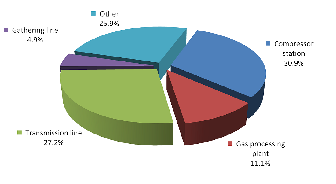 Location of accidents: Over the past 10 years (2005–2014), 42% of pipeline accidents (Table 4) occurred at compressor stations and gas processing plants, and 27% occurred on transmission lines (Figure 2). The remaining pipeline accidents (31%) occurred at pump stations, terminals, meter stations, and on gathering lines.