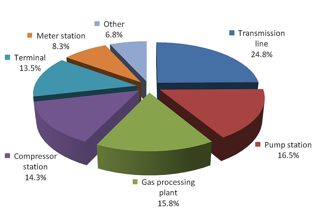 Location of incidents: In 2014, 25% of pipeline incidents (Table 4) occurred on transmission lines, followed by 17% at pump stations, 16% at gas processing plants, 14% at compressor stations, 14% at terminals, and 8% at meter stations. The remaining incidents occurred on gathering lines, at an injection/delivery facility, or at other facilities (Figure 4).