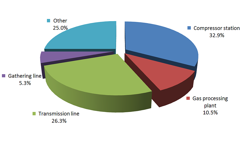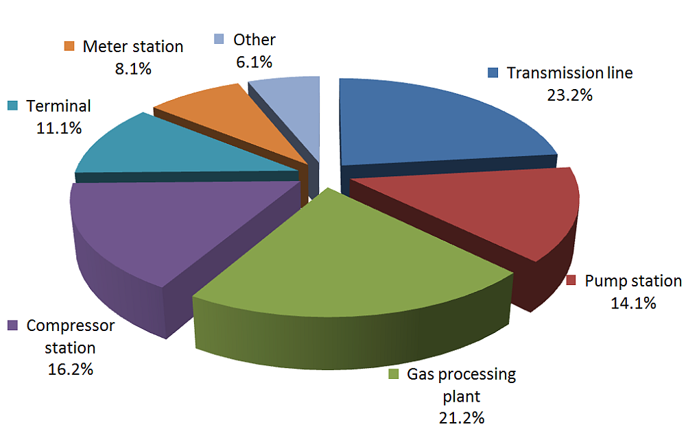 Over the past 10 years (2006–2015), 43.4% of pipeline accidents occurred at compressor stations and gas processing plants, and 26.3% occurred on transmission lines (Figure 2). The remaining pipeline accidents (30.3%) occurred at pump stations, terminals, meter stations, and on gathering lines.
