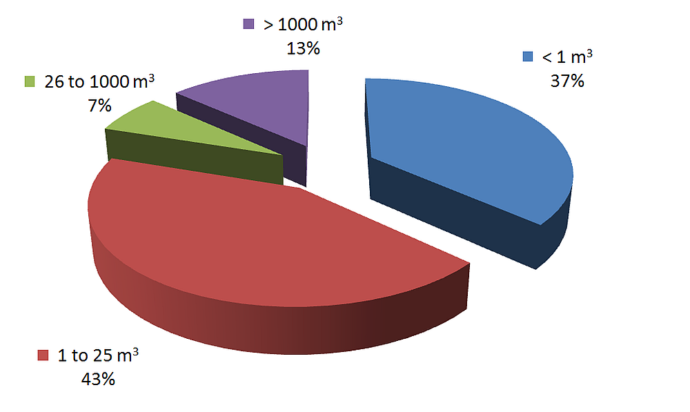 In 2015, 30% of the incidents involved no release of product and 23% of the incidents involved a release of less than 1 cubic metre of natural gas, oil, other petroleum product, or non-petroleum product (e.g., sulphur). Three incidents involved a release of 1.5 to 25 cubic metres (between 9.44 and 157 bbl) of crude oil. Thirteen incidents involved a release of 26 to 1000 cubic metres of natural gas, and 4 incidents involved a release of over 1000 cubic metres of natural gas. Three incidents involved a release of 1 to 25 cubic metres of sour gas, and 5 involved a release of 26 to 1000 cubic metres of sour gas (Figure 5).