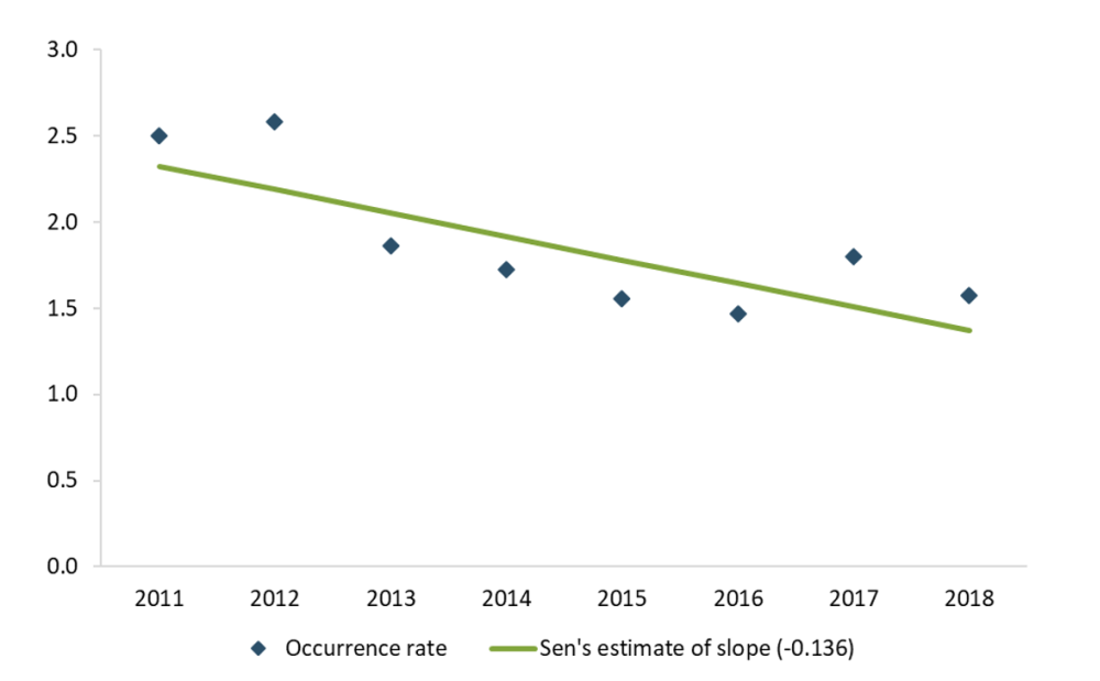 | Year | Occurrence rate | Sen's estimate of slope (-0.136) |