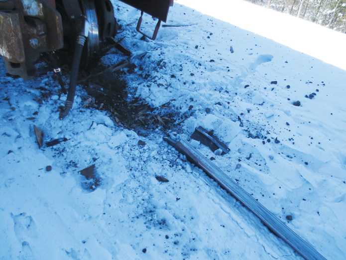Une roue brisée (Photo 1) a été repérée sur un autre wagon-citerne qui n'a pas déraillé. Le wagon en question se trouvait 2 wagons devant le matériel roulant déraillé. On a également trouvé des rails brisés près du site du déraillement (Photo 2).